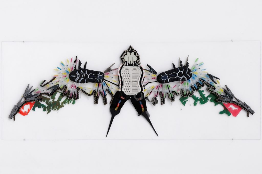 Anna Solal appartient à une nouvelle génération d’artistes qui se distingue par une prédilection pour le « fait main », pour le croisement sans hiérarchie de process empruntés à l’art et à l’artisanat. Elle produit ainsi des assemblages à partir d’objets rebuts (écrans brisés de smartphones, semelles de chaussures, bouts de moquettes, etc…) qu’elle glane aux cours de ses déambulations et qu’elle combine à des objets cheap (grattoirs, peignes, barrettes à cheveux, pinces à linge, chaines de vélo) issus d’une économie mondialisée. Elle y insère des photographies de groupes d’hommes, de bâtiments désaffectés et de délicats dessins au crayon de couleur à l’iconographie toute classique, natures-mortes ou femmes à la toilette. Entre logos industriels post-apocalyptiques et bricolages primitifs, ses œuvres déclinent un registre de motifs à l’esthétique à la fois naïve, pop et trash : des fleurs, des oiseaux, des cerfs-volants et des ruches. […] Anna Solal procède, pour construire ses puzzles-rébus, par hésitations et par touches successives, dans un va-et-vient incessant entre ce que la forme suggère et ce vers quoi elle veut aller.