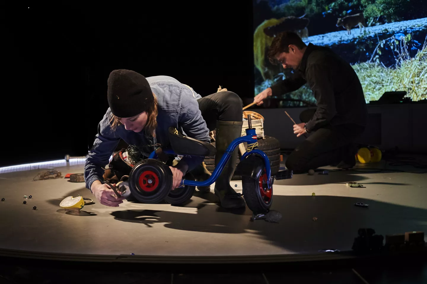Ce spectacle est un hommage amusant à Jean Bordes dit « Le Pec de Matiloun », artiste hors normes qui, en cachette se rendait dans les dépotoirs pour y ramasser des bidules, machins, trucs… qu’il ficelle et entortille ou accroche aux arbres dans ses collines d’Ariège. Des trésors avec lesquels ils créaient des jouets, des véhicules, des assemblages inventifs. À la manière de ce créateur d’art brut, deux touche-à-tout, dompteurs de sons, de mouvements et de matières jouent avec des objets qu’ils créent devant vous. Un fabuleux voyage de l’invisible vers le visible !