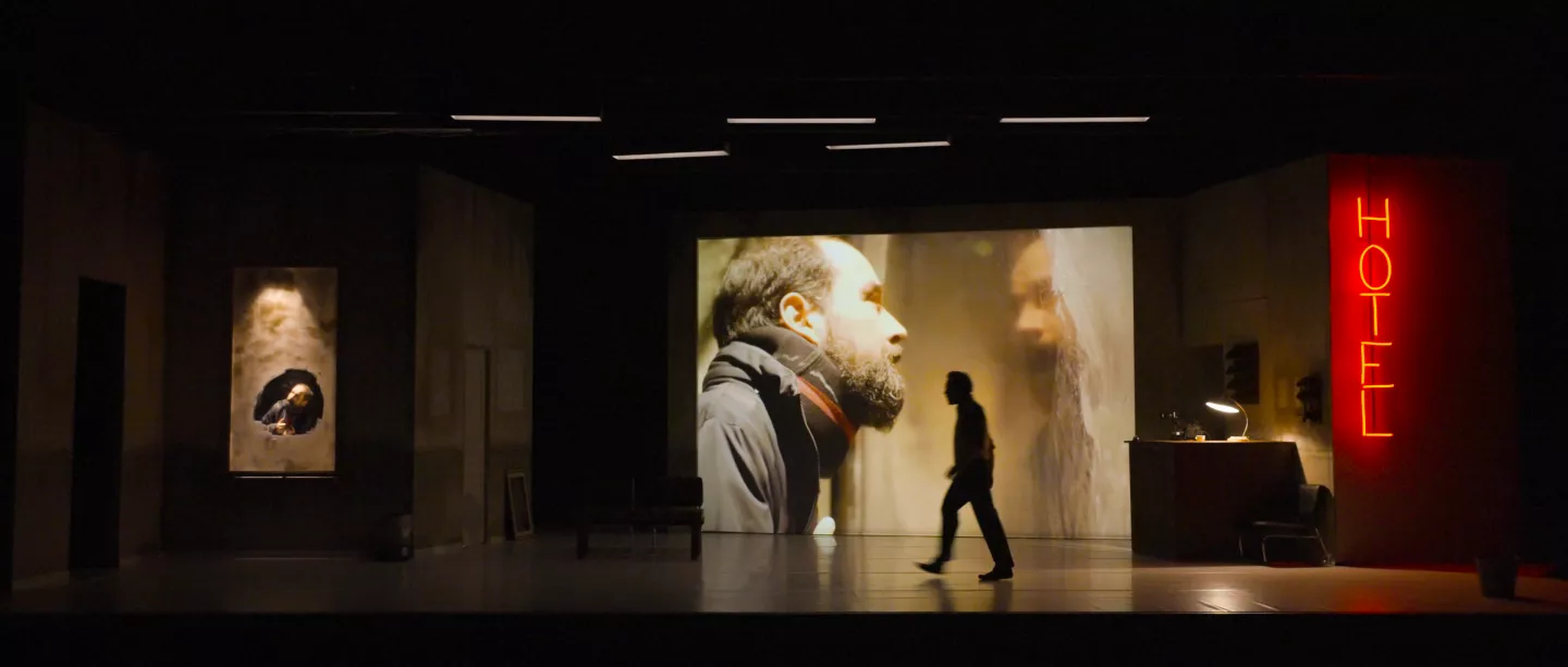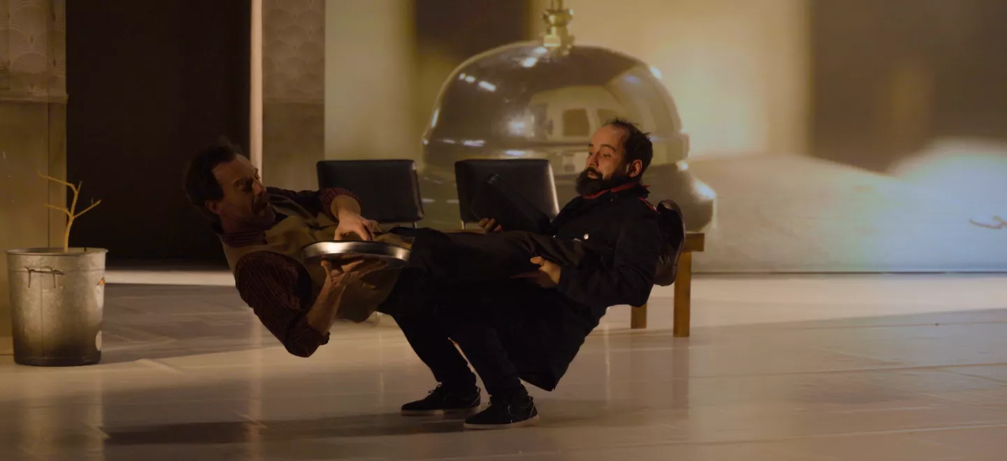 Bienvenue à l’Hôtel Bellevue ! C’est l’hiver et le hall est un peu délabré. Des voyageurs sont sur le point de partir mais aucune porte ne s’ouvre sur l’extérieur. La caméra de surveillance de l’hôtel filme leurs allées et venues au comptoir. Faute de trouver une issue physique à leur histoire, ils vont s’enfuir dans un voyage mental rocambolesque. Dans ce huis-clos burlesque, les voyageurs vont explorer les couloirs de l’hôtel comme autant de chemins à découvrir. De surprises en rebonds, cette pièce à la croisée du cinéma, de la danse et du théâtre nous entraîne dans une épopée où se mêlent intrigues, suspens et quiproquos.