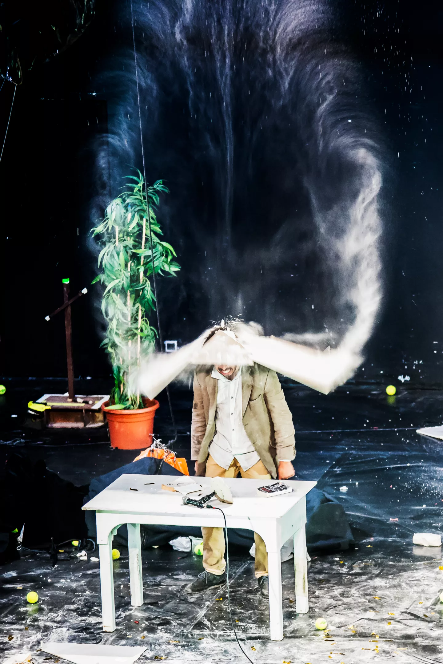 Sous le feu d’une série de situations aussi hostiles que cocasses – rafales de balles de tennis, pétards qui claquent, plafond qui s’effondre… –, cinq acrobates composent avec l’imprévisibilité du réel. Leur gestuelle explore ces instants où le contrôle échappe et où les corps se déforment au millimètre près pour retrouver l’équilibre. Ils affrontent les risques seuls ou en groupe, avec humour et créativité, et nous entraînent dans un univers burlesque et poétique.