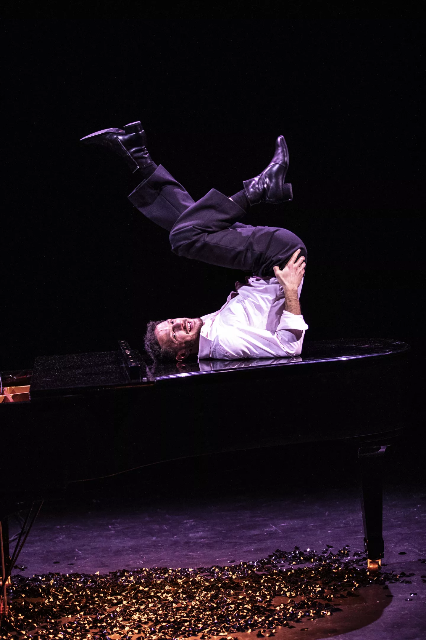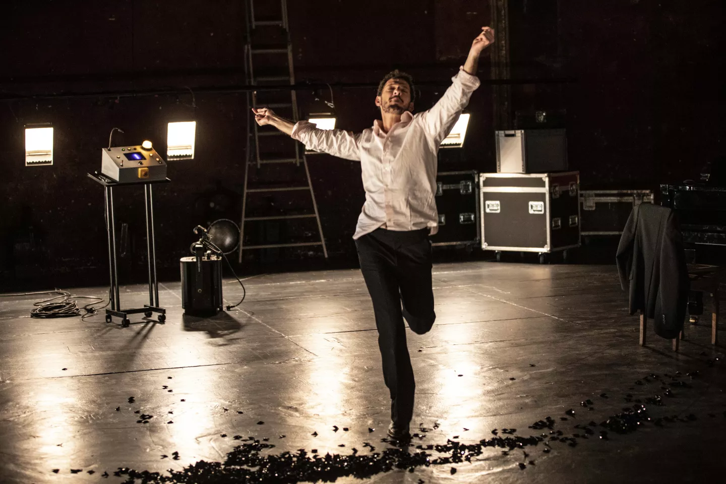 seul en scène écrit par Vincent Dedienne, Juliette Chaigneau, Mélanie Le Moine et Anaïs Harté./ mis en scène Juliette Chaigneau / scénographie Lucie Joliot / création lumière Kelig Le Bars / chorégraphe Yan Raballand