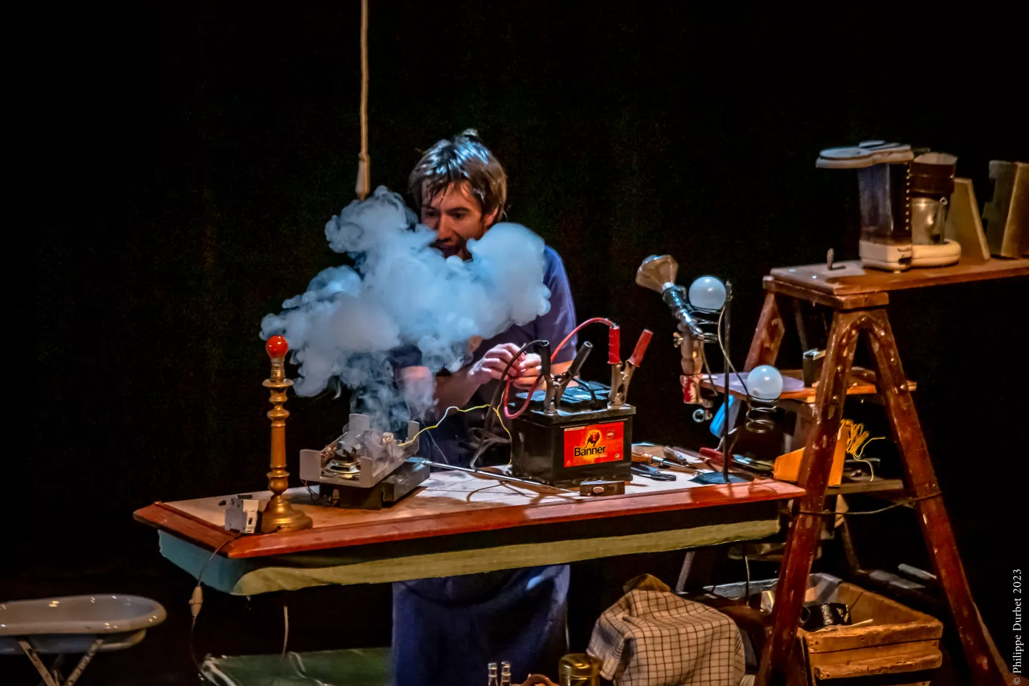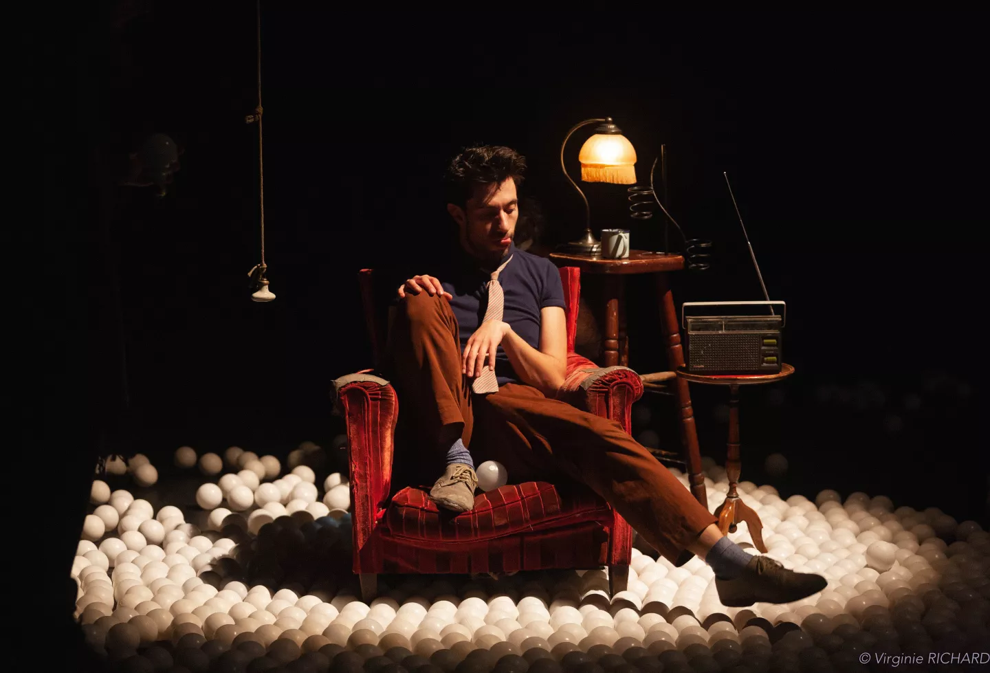 Seul, un homme (un savant ? un chercheur ?) évolue dans un espace qui pourrait aussi bien être un refuge qu’un atelier de fortune. Avec pour seul rapport au réel une radio qui distille inlassablement une actualité catastrophiquement burlesque. Jovial, énergique et rêveur, cet homme se plonge à bras le corps dans ses occupations jonglistiques. Il s'invente une vie pleine de balles. Parfois, ses inventions se retournent contre lui.